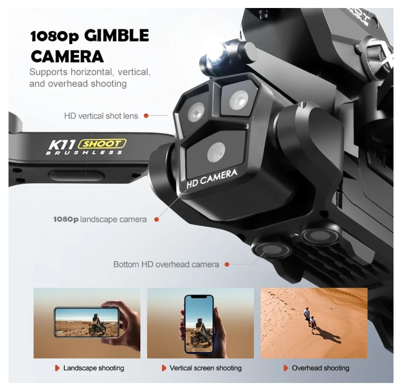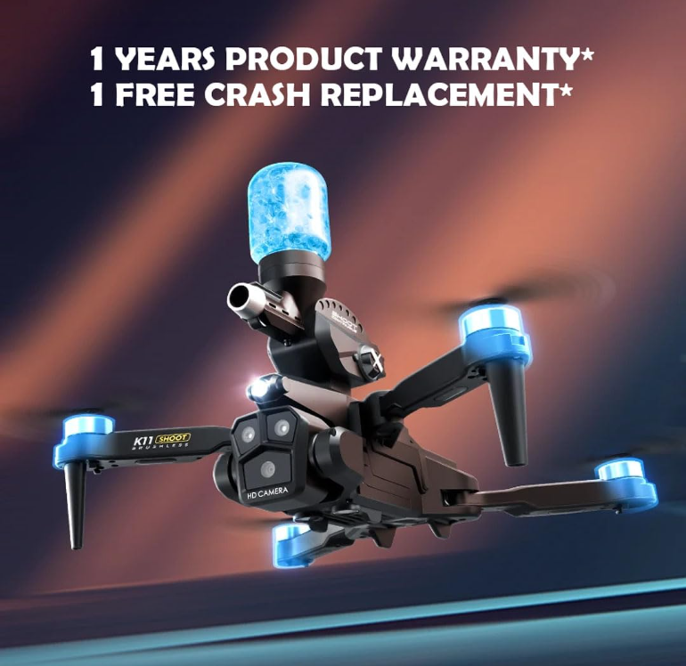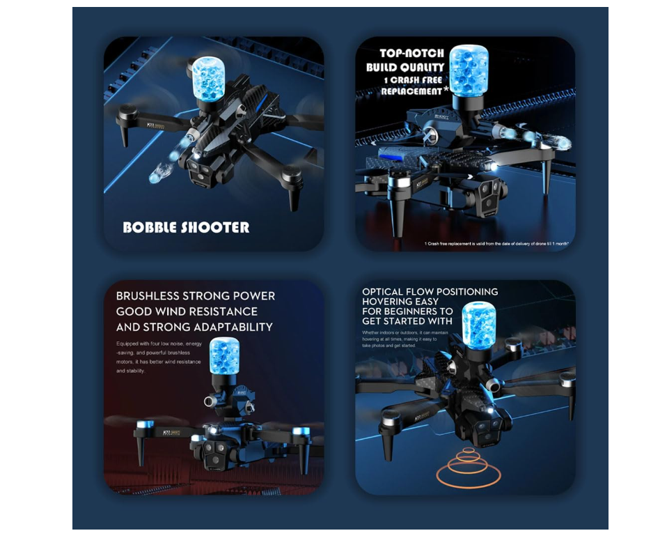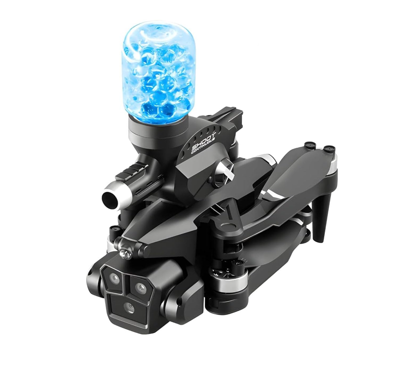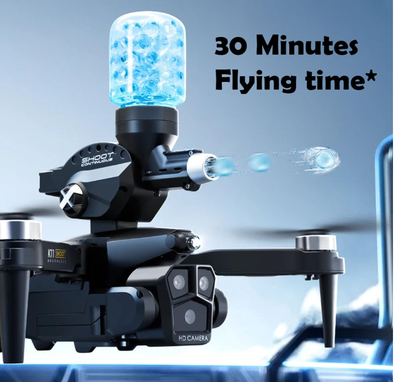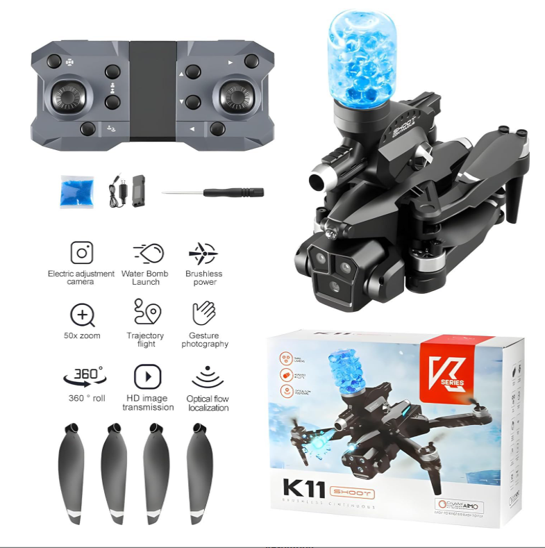 Product Data: -Color: Black/Grey Remote control mode: left throttle (right direction) Camera data: Resolution: 8k Transmission signal: WiFi transmission Main material: ABS Product Specification: Folding: 8 * 14 * 14cm/Unfolding: 24 * 24 * 14cm Product color: Carbon fiber color/black Whole product weight (including storage box and color box): 521G Airframe takeoff weight (including battery): 178G Packaging specifications (length * width * height): 23 * 9 * 17cm Product (aircraft) battery parameters: 3.7V-1800mAh carp battery Remote control battery parameters: AAA * 3-6V alkaline battery (Not Included) Charging method: USB charging Charging time: approximately 60 minutes Flight time: approximately 12 minutes Remote control distance: approximately 80-100 meters Flight altitude: approximately 100 meters Flight environment: indoor/outdoor Product features: Water bomb launch (single shot/continuous shot)+brushless motor+three shot (front shot/vertical shot/overhead shot) optical flow positioning electric lens 4k high-definition pixel storage type remote control pneumatic fixed height high-definition image transmission Gravity induction trajectory pointing 2.4G signal stunt rollover Speed switch, mobile phone control, one landing, one takeoff, one key landing